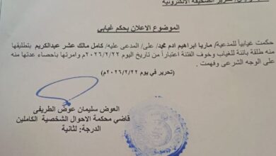 بسم الله الرحمن الرحيم الجهاز القضائي ولاية الجزيرة محكمة القاضي المقيم الباقير اعلان بالنشر الى : عثمان احمد صابون حامد…