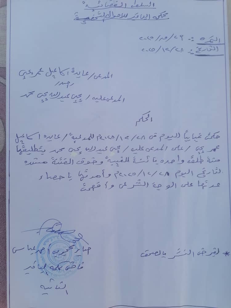حكمت غيابيا اليوم في 28 /12 / 2025 للمدعية / عايدة إسماعيل عمر يحى /على / المدعي عليه / يحى عبد الله يحي محمد بتطليقها منه طلقة واحدة بائنة للغيبة وخوف الفتنة مسندة لتاريخ اليوم 28 / 12 / 2025 وامرتها باحصاء على الوجه الشرعي وافهمت.