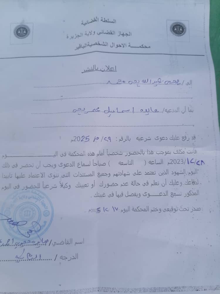 فانت مكلف بموجب هذا بالحضور شخصيا امام هذه المحكمة في يوم ٢٠٢٥/١٢/٢٨م الساعة التاسعة صباحا لسماع الدعوي ويجب ان تحضر في ذلك اليوم الشهود الذين تعتمد على شهادتهم وجميع المستندات التي تنوى الاعتماد عليها تأييدا لدفاعك وعليك أن تعلم في حالة عدم حضورك أو تعيينك وكيلاً شرعياً للحضور في اليوم المذكور نسمع الدعوى ويفصل فيها في غيبتك.