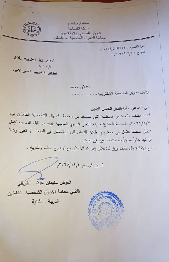 انت مكلف بالحضور بالجلسة التي ستنعقد من محكمة الاحوال الشخصية الكاملين يوم ٢٠٢٦/١/٧م الساعة العاشرة صباحاً لنظر الدعوي الموجهة اليك من قبل المدعيه امل فضل محمد فضل في موضوع طلاق للشقاق فان لم تحضر في الميعاد أو تعين وكيلاً او تبد عذراً مقبولاً سمعت الدعوي في غيبتك