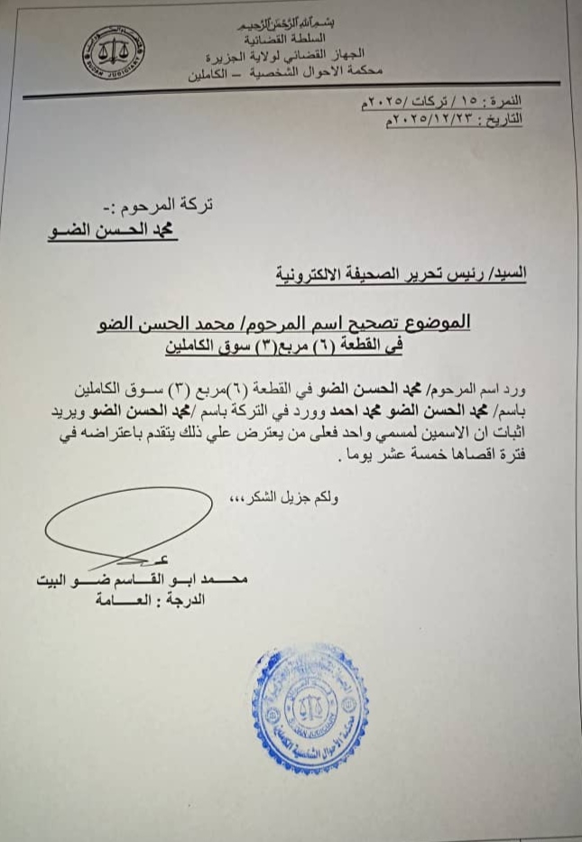 إعلان بالنشر من محكمة الأحوال الشخصية الكاملين بخصوص تصحيح اسم المرحوم / محمد الحسن الضو في القطعة (٦) مربع (۳) سوق الكاملين