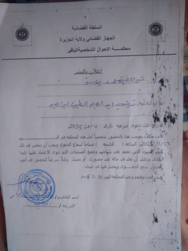بما ان المدعية/ زينب ابراهيم الطيب ابراهيم قد رفع عليك دعوى شرعيه بالرقم : ٧/ق/٢٠٢٥م