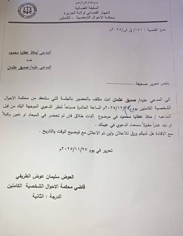 الي المدعى عليه : صديق عثمان انت مكلف بالحضور بالجلسة التي ستنعقد من محكمة الاحوال الشخصية الكاملين يوم ٢٠٢٥/١٢/١٤م الساعة العاشرة صباحاً لنظر الدعوي الموجهة اليك من قبل المدعيه / ملاذ عطايا محمود في موضوع اثبات طلاق فان لم تحضر في الميعاد أو تعين وكيلاً او تبد عذراً مقبولاً سمعت الدعوي في غيبتك .
