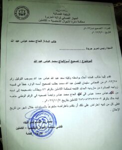 تقدم إلينا طالب المادة اعلاه بواسطة وكيله / سعد عبدالله عباس عبدالله بموجب التوكيل رقم ٢٠٢٣/٢٥م من المحامي سليمان الفضل عبدالله محمد بطلب تصحيح اسمه الوارد خطأ في قسيمة زواجه الصادرة من مأذونية الجدايد التابعة لمحكمة الكاملين بالرقم (٤٧) ويطالب بتصحيحه الي اسمه من (عباس محمد عباس) الي (الحاج محمد عباس) وايضا تصحيحه في الرقم الوطني خاصة ابنه خالد بالرقم ٢-٨٦٣٥٩٧٥-٢٥٦ الكاملين بتاريخ:٢٠٢٢/١١/٧م .