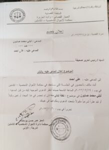 انت مكلف بالحضور في الجلسة التي ستنعقد في محكمة الاحوال الشخصية _ الكاملين في يوم: ٢٠٢٣/١٢/١٩م الساعة التاسعة صباحا لنظر الدعوي الموجهة اليك من قبل المدعية : ليلي محمد صابون في موضوع: نفقة لبنتي منه فان لم تحضر في هذا الميعاد او تعين وكيلا او تبد عذرا شرعيا مقبولا سمعت الدعوى وحكم فيها في غيبتك.