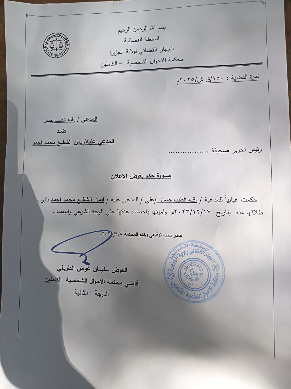اعلان بالنشر بحكم غيابي من محكمة الأحوال الشخصية الكاملين للمدعي عليه / ايمن الشفيع محمد احمد