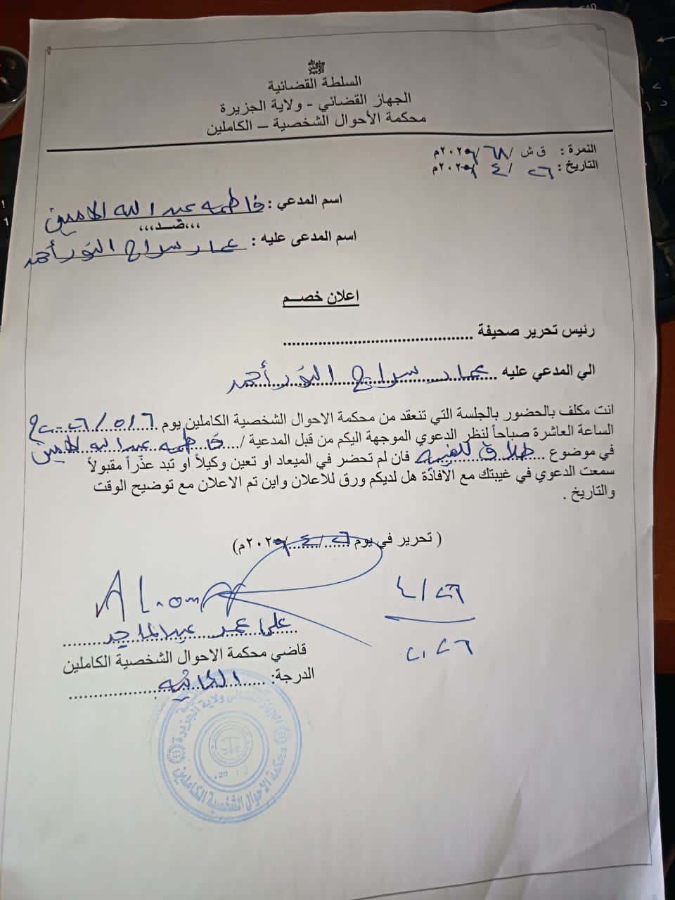 انت مكلف بالحضور بالجلسة التي تنعقد من محكمة الاحوال الشخصية الكاملين يوم ٢٠٢٦/٥/٦م الساعة العاشرة صباحاً لنظر الدعوي الموجهة اليكم من قبل المدعية/ فاطمه عبد الله الامين في موضوع طلاق للغيبة فان لم تحضر في الميعاد أو تعين وكيلاً أو تبد عذراً مقبولاً سمعت الدعوي في غيبتك