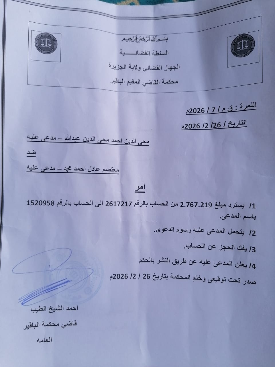 صدر تحت توقيعي وختم المحكمة في اليوم 26 شهر 2 سنة 2026