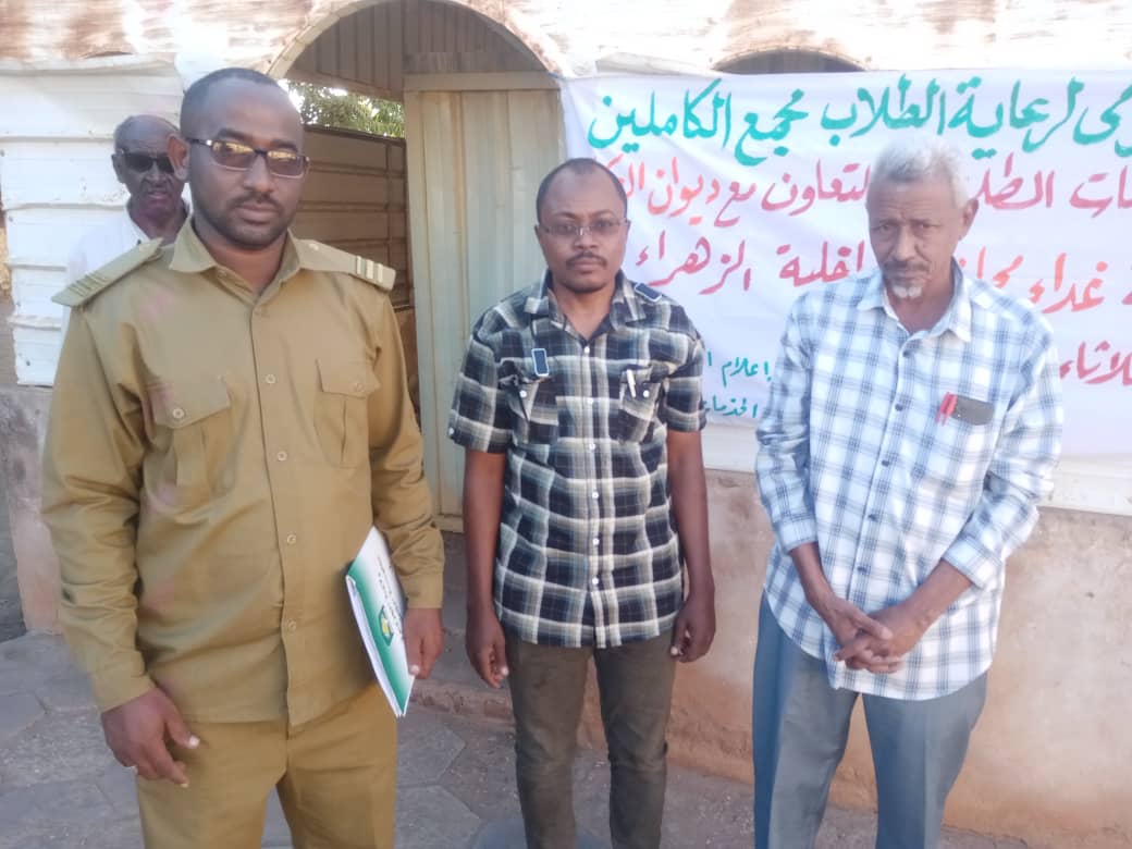 دشن الأستاذ عبد الرحمن مجمد أحمد فضل المولي المدير التنفيذي لمحلية الكاملين الوجبة الغذائية المجانية المقدمة من صندوق دعم الطلاب بالتعاون مع ديوان الزكاة بمجمع الزهراء لطلاب كلية الاداب فرع جامعة الجزيرة بالكاملين.