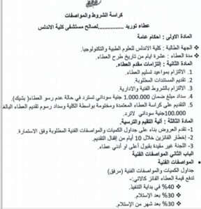 عطاء لتوريد مواد كهرباء _ سباكة _ بورسلين _ كلادن _ المنيوم _ أدوات نقاشة لمستشفى كلية الاندلس التعليمي بمدني