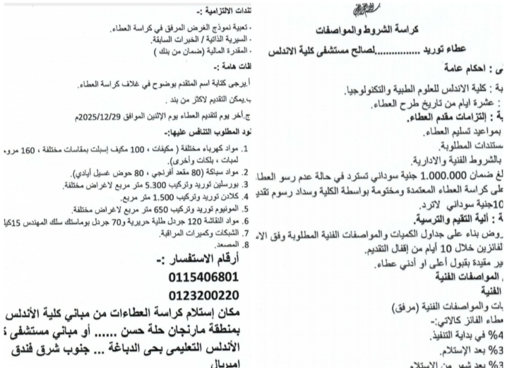 ترغب إدارة مستشفى كلية الاندلس التعليمي بمدني عن حاجتها لتوريد :_