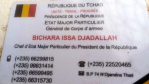 عثرت الاستخبارات العسكرية أمس الأربعاء على (كرت) الفريق بشارة عيسى جاد الله إبن خالة حميدتي وعضو المجلس العسكري الإنتقالي التشادي في العتاد الذي خلفته القوات التي هاجمت سلاح المهندسين يوم أمس.