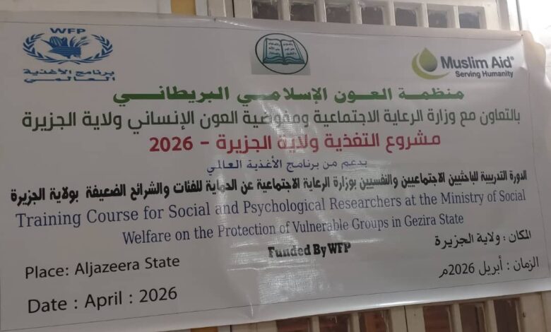 الظهيرة – ودمدني /سلمي امين : اختُتمت اليوم بمفوضية العون الإنساني بولاية الجزيرة فعاليات الدورة التدريبية للباحثين الاجتماعيين والنفسيين، التي نظمتها منظمة العون الإسلامي البريطاني بالتعاون مع وزارة الرعاية الاجتماعية ومفوضية العون الإنساني، وذلك ضمن مشروع التغذية للعام 2026 بدعم من برنامج الأغذية العالمي. وأكدت الأستاذة حنان يوسف، مدير عام وزارة الرعاية الاجتماعية المكلف بولاية الجزيرة، أن مادة الحماية تمثل حجر الأساس في عمل الوزارة والمفوضية والمنظمات، مشيرةً إلى أنها تشمل مختلف الجوانب الاقتصادية والاجتماعية والنفسية والصحية، إضافة إلى البعد البيئي. وأوضحت أن الورشة استهدفت الفئات الهشة كافة، بما في ذلك النساء والأطفال وكبار السن، مع التركيز على آليات الإحالة والمتابعة والتقييم. وأشادت حنان يوسف بجهود الميسرين ومنظمة العون الإسلامي البريطاني في إنجاح الدورة، مثمنةً دور الباحثين المشاركين وتفاعلهم الكبير خلال أيام التدريب. من جانبه، أكد الأستاذ أسعد السر، مفوض العون الإنساني بولاية الجزيرة، أهمية الدورة في تعزيز قدرات الكوادر العاملة في المجال الاجتماعي، خاصة في جانب الحماية، مشيداً بالمحتوى العلمي المقدم والنقاشات التي أسهمت في بلورة رؤية متكاملة. وأشار إلى أن مخرجات الورشة تمثل خطوة مهمة نحو تأسيس إطار نظري وعملي لبرامج الحماية في الولاية، قائم على خبرات باحثين متخصصين، ومتكامل مع رؤية الوزارة والمنظمات العاملة في المجال. وأضاف أن المرحلة المقبلة ستشهد توحيد الجهود بين الجهات الرسمية والمنظمات،…