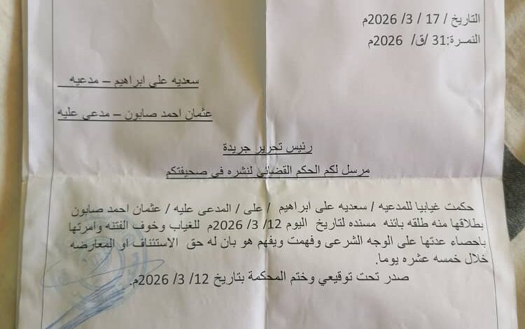 بسم الله الرحمن الرحيم السلطة القضائية الجهاز القضائي ولاية الجزيرة محكمة الاحوال الشخصية الباقير التاريخ:٢٠٢٦/٣/١٢م النمرة/ ٣١/ق/٢٠٢٦م سعدية علي ابراهيم/ مدعية عثمان احمد صابون/ مدعي عليه حكمت غيابيا للمدعية/سعدية علي ابراهيم/علي/ المدعي عليه/ عثمان احمد صابون كافي بطلاقها منه طلقة بائنة مسندة لتاريخ اليوم:٢٠٢٦/٣/١٢م وامرتها باحصاء عدتها علي الوجه الشرعي وفهمت ويفهم هو بان له حق المعارضة او الاستئناف خلال خمسة عشر يوما صدر تحت توقيعي وختم المحكمة بتاريخ:٢٠٢٦/٣/١٢م احمد الشيخ الطيب قاضي محكمة الباقير الدرجة : العامة
