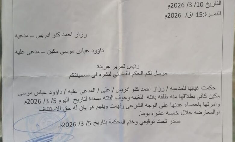 بسم الله الرحمن الرحيم السلطة القضائية الجهاز القضائي ولاية الجزيرة محكمة الاحوال الشخصية الباقير التاريخ:٢٠٢٦/٣/٥م النمرة/ ١٥/ق/٢٠٢٦م رزاز احمد كنو اديس/ مدعية داؤود عباس موسي مكين/ مدعي عليه حكمت غيابيا للمدعية/ رزاز احمد كنو اديس/علي/ المدعي عليه/ داؤود عباس موسي مكين كافي بطلاقها منه طلقة بائنة للغيبة وخوف الفتنة مسندة لتاريخ اليوم:٢٠٢٦/٣/٥م وامرتها باحصاء عدتها علي الوجه الشرعي وفهمت ويفهم هو بان له حق المعارضة او الاستئناف خلال خمسة عشر يوما. صدر تحت توقيعي وختم المحكمة بتاريخ:٢٠٢٦/٣/٥م احمد الشيخ الطيب قاضي محكمة الباقير الدرجة : العامة