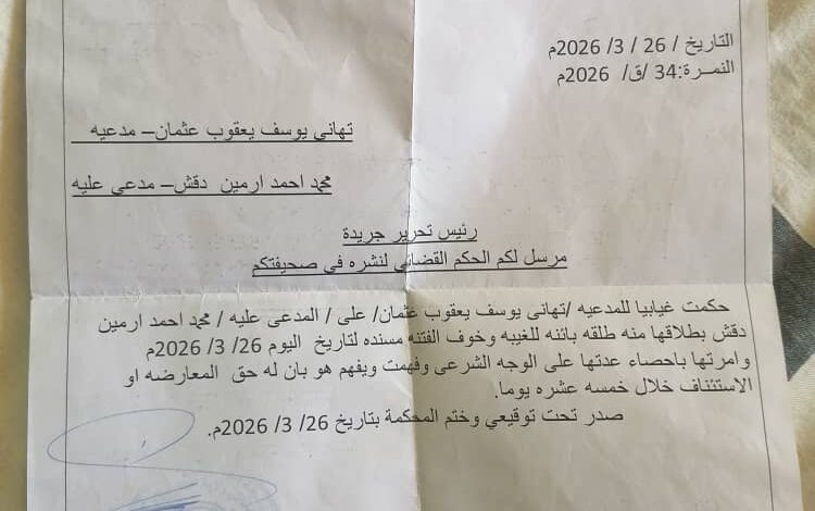 بسم الله الرحمن الرحيم السلطة القضائية الجهاز القضائي ولاية الجزيرة محكمة الاحوال الشخصية الباقير التاريخ:٢٠٢٦/٣/٢٦م النمرة/ ٣٤/ق/٢٠٢٦م تهاني يوسف يعقوب عثمان/ مدعية محمد احمد ارمين دقش/ مدعي عليه حكمت غيابيا للمدعية/ تهاني يوسف يعقوب عثمان /علي/ المدعي عليه/ محمد ارمين دقش بطلاقها منه طلقة بائنة للغيبة وخوف الفتنة مسندة لتاريخ اليوم:٢٠٢٦/٣/٢٦م وامرتها باحصاء عدتها علي الوجه الشرعي وفهمت ويفهم هو بان له حق المعارضة او الاستئناف خلال خمسة عشر يوما. صدر تحت توقيعي وختم المحكمة بتاريخ:٢٠٢٦/٣/٢٦م احمد الشيخ الطيب قاضي محكمة الباقير الدرجة : العامة