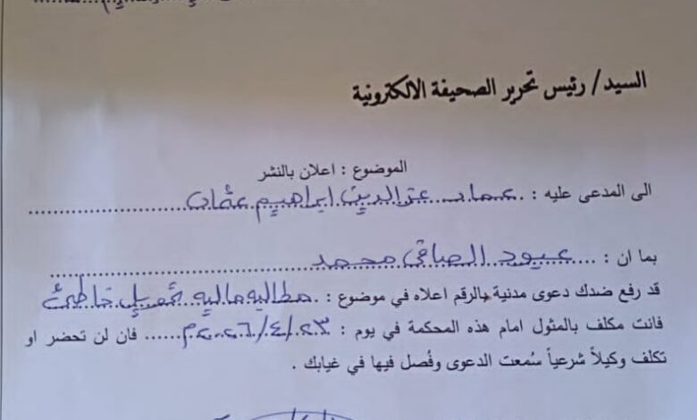 بسم الله الرحمن الرحيم السلطة القضائية الجهاز القضائي لولاية الجزيرة محكمة القاضي المقيم الكاملين النمرة : ق م/ ٢٠٢٦/٨٩م التاريخ : ٢٠٢٦/٤/١٢م المدعي : عبود الصافى محمد ضد المدعى عليه : عماد عز الدين ابراهيم عثمان الموضوع : اعلان بالنشر الى المدعى عليه : عماد عز الدين ابراهيم عثمان. بما ان : عبود الصافي محمد قد رفع ضدك دعوى مدنية بالرقم اعلاه في موضوع : مطالبه ماليه تحويل خاطئ فانت مكلف بالمثول امام هذه المحكمة في يوم : ٢٠٢٦/٤/٢٣م فان لن تحضر او تكلف وكيلاً شرعياً سمعت الدعوى وفصل فيها في غيابك صدر تحت توقيعي وختم المحكمة في يوم: ٢٠٢٦/٤/١٢م. على عمر عبد الماجد قاضي المحكمة المدنية – الكاملين الدرجة الثانية