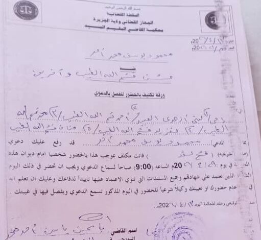 بسم الله الرحمن الرحيم السلطة القضائية الجهاز القضائي ولاية الجزيرة محكمة القاضي المقيم المسيد التاريخ : 13 /4 /2026 النمرة : ق م /12 /2026 المدعي : محمود يوسف محمد احمد ضد : حسن قسم الله الطيب واخرين ورقة تكليف بالحضور للدعوى إلى / لبني ازهري العبيد /أحمد قسم الله الطيب /محمد قسم الله الطيب / تغريد قسم الله الطيب /حنان قسم الله الطيب. بما ان المدعي محمود يوسف محمد احمد قد رفع عليكم دعوى شرعية (فسخ عقد) فانتم مكلفون بالحضور شخصيا أمام هذه المحكمة في اليوم 29 / 4 /2026 عند الساعة 9:00 صباحا وذلك للنظر في الدعوى القضائية المقامة ضدكم وعليكم أن تعلموا أنه وفي حالة عدم حضوركم او تعيين وكيلا شرعيا للحضور في اليوم المذكور سمعت الدعوى في غيبتكم وفصل فيها… صدر تحت توقيعي وختم المحكمة في اليوم 13 /4 /2026. ياسمين ياسين احمد محمد الدرجة :الأولى